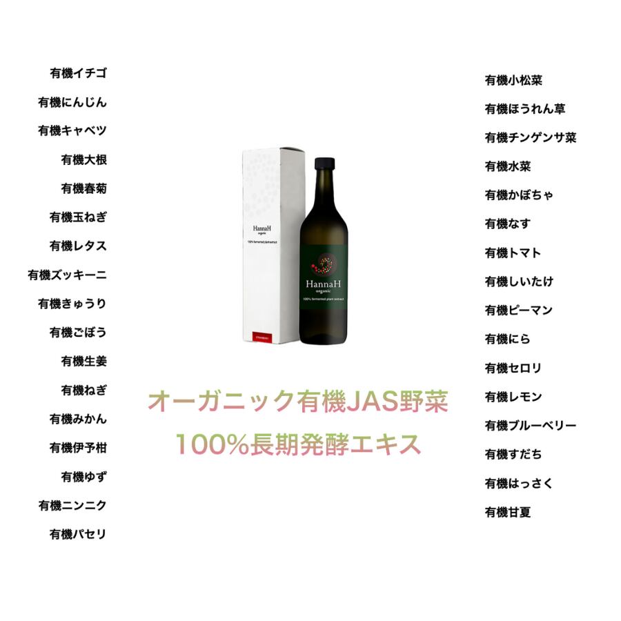 有機イチゴ発酵エキス(有機イチゴ(トルコ産)、有機黒糖)、有機植物発酵エキス(有機黒糖、有機にんじん、有機キャベツ、有機大根、有機春菊、有機レタス、有機ズッキーニ、有機きゅうり、有機ごぼう、有機しょうが、有機ねぎ、有機玉ねぎ、有機みかん、有機伊予柑、有機ゆず、有機すだち、有機小松菜、有機チンゲン菜、有機水菜、有機かぼちゃ、有機トマト、有機なす、有機レモン、有機はっさく、有機甘夏、有機ブルーベリー、有機セロリ、有機ピーマン、有機にら、有機ほうれん草、有機生しいたけ、有機にんにく、有機パセリ)